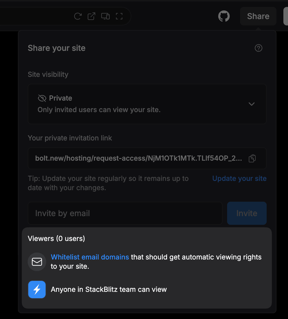 Share working prototypes with private links that only invited viewers can access. Test features internally before public launch. You can also whitelist an entire email domain for easier internal access instead of inviting people one by one.