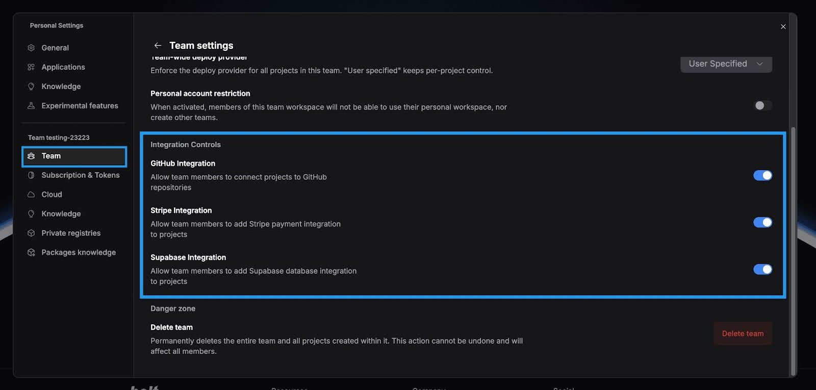 Control access to GitHub, Netlify, and Supabase integrations across your entire team. Enable what you need. Disable what you don't.