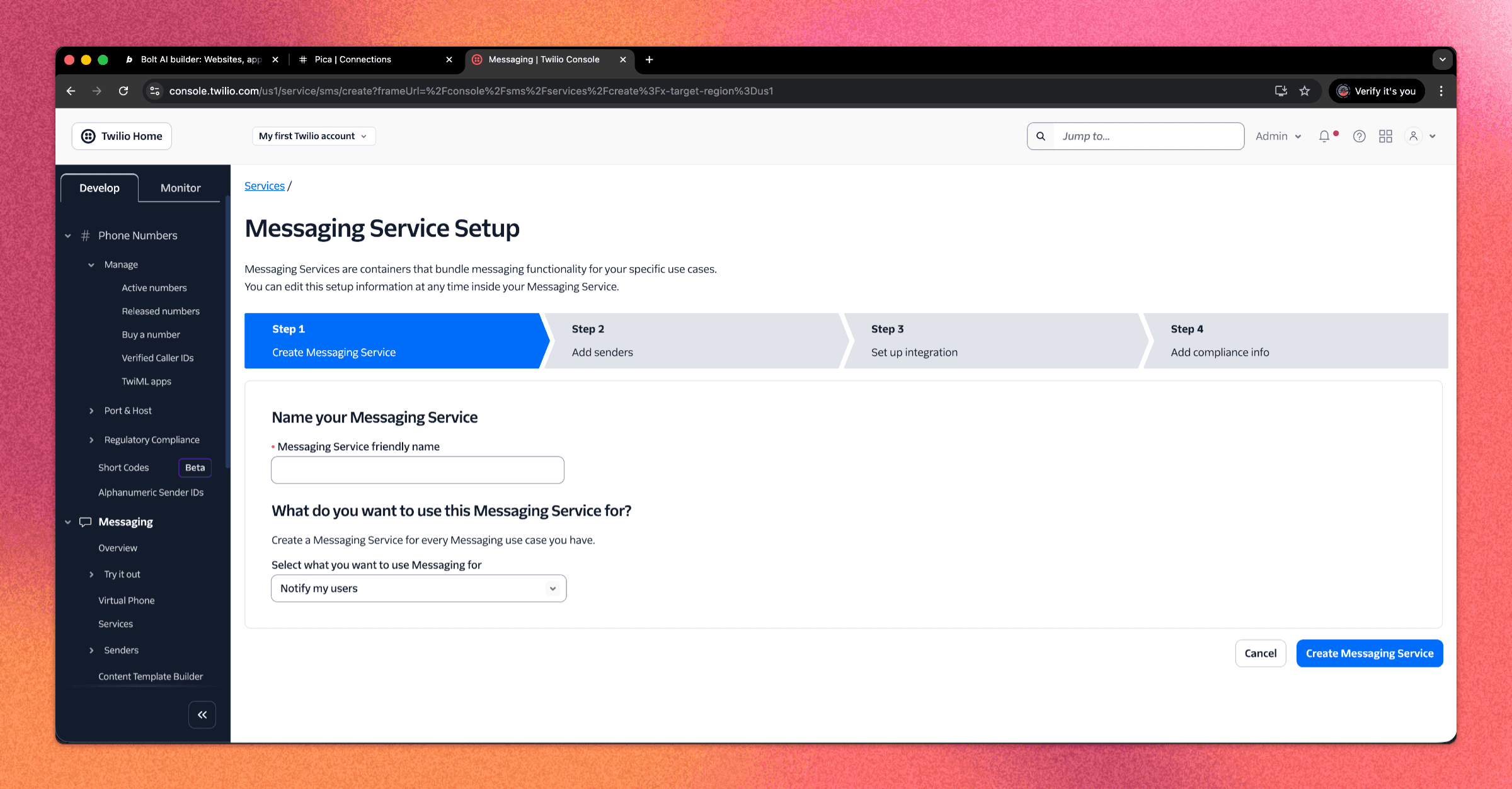 Before connecting Twilio to Bolt, you need a messaging service.