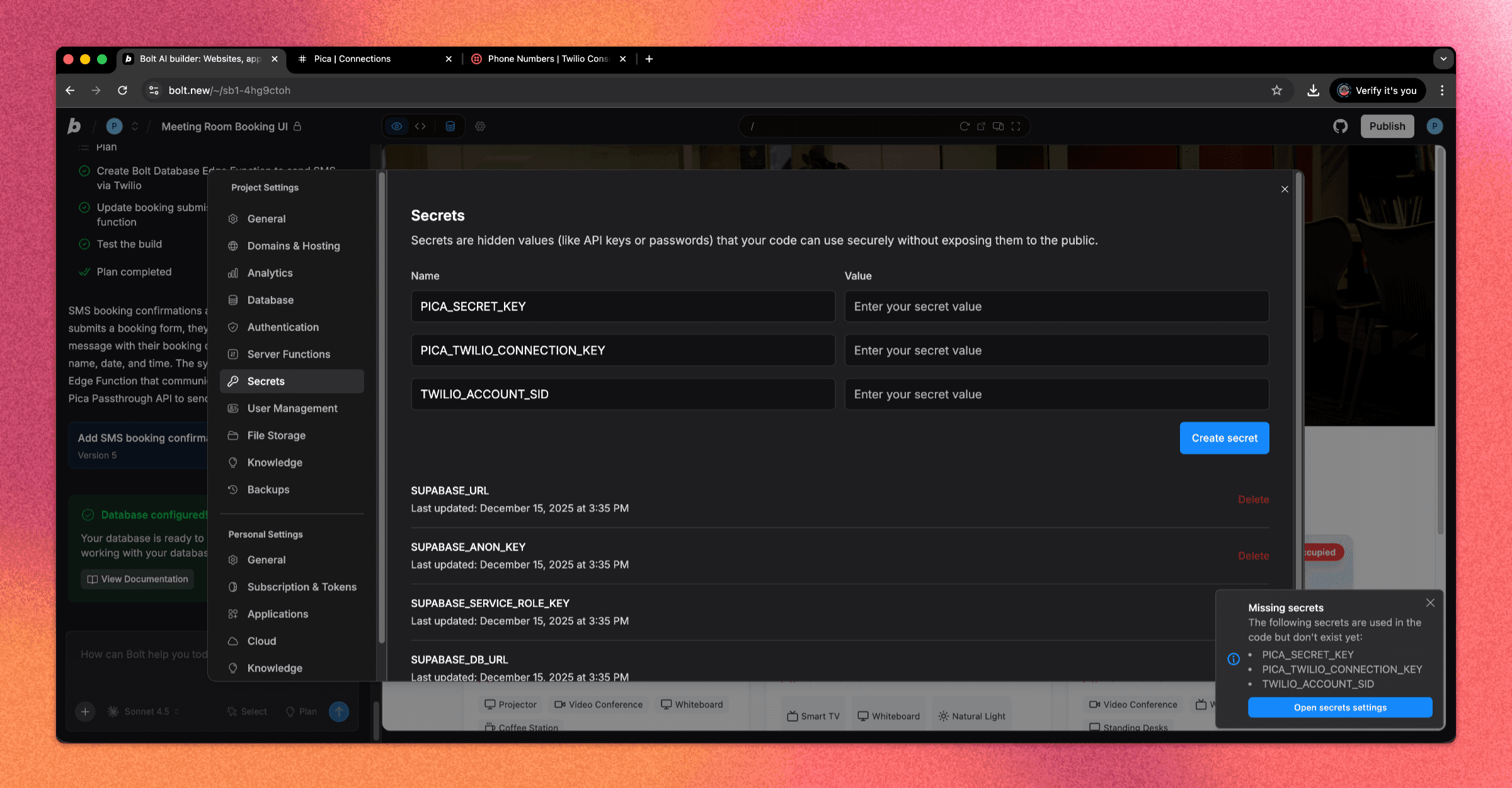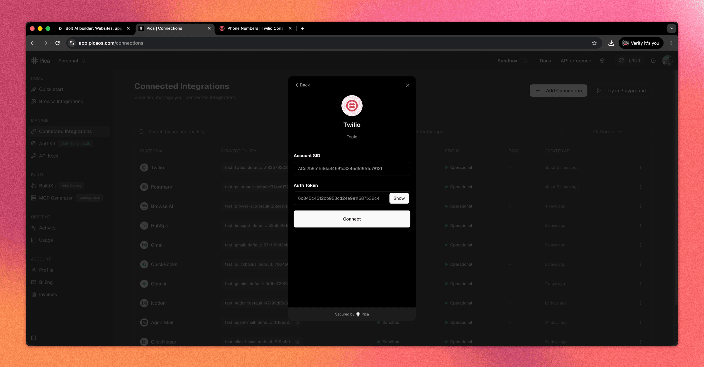 Now, we’ll connect Twilio so Bolt can use it safely.